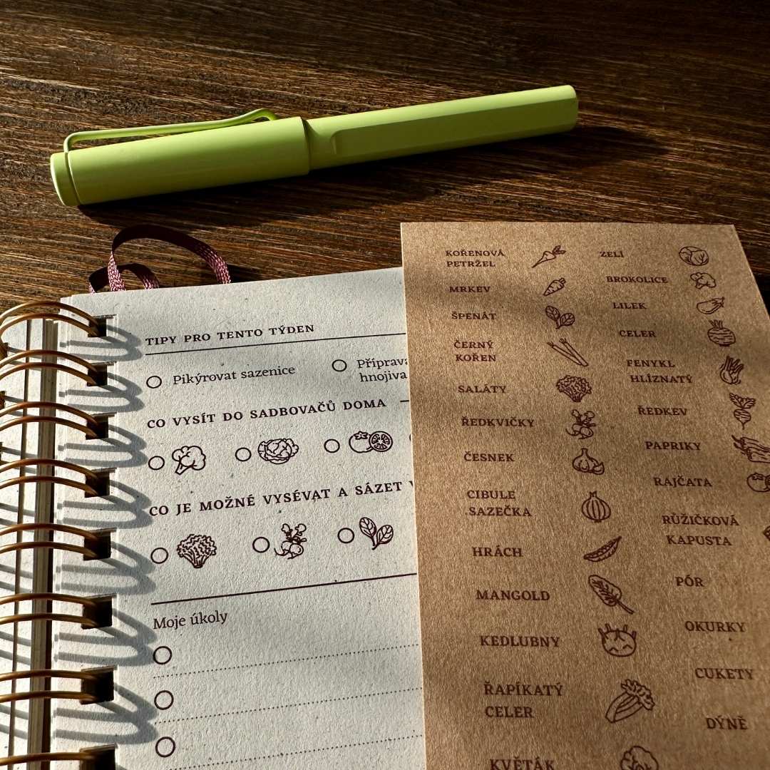 Je v něm spousta místa na plánování zahrady, poznámky k výsevům a sazenicím i vaše nápady. Samozřejmě nechybí ani podrobný návod, co v kterém týdnu v roce dělat.